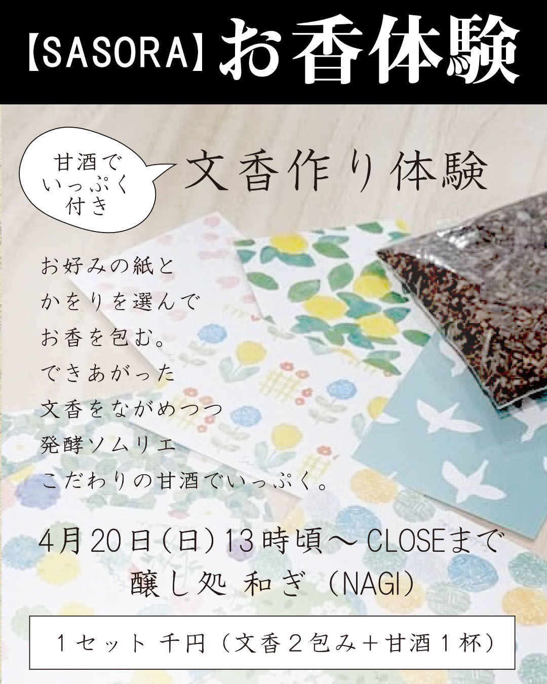 SASORAとコラボ・監修しております御香体験・ワークショップのご案内。